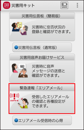 1.アプリケーションシートの「あんしん安全(安心・安全)」内、または最初に表示されている画面から「緊急速報メール」をタップ