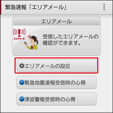エリアメールアプリからの操作となる機種もあります。また、らくらくスマートフォンの場合、ホーム画面の「あんしんツール」→「災害用キット」→「緊急速報「エリアメール」」→「メニュー(縦に3つの点のアイコン)」→「設定」→「エリアメールの許可」から設定します