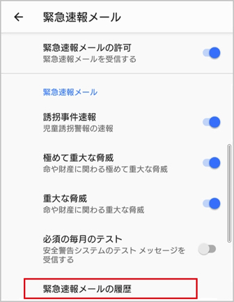 3.「緊急速報メールの履歴」を選択し、設定完了