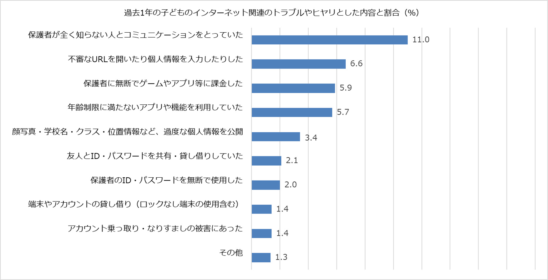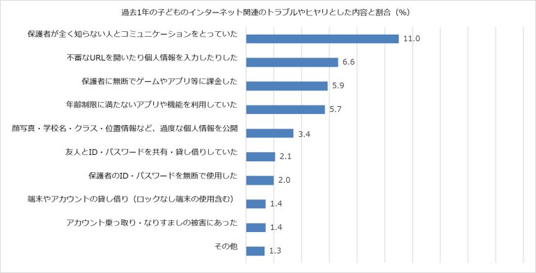 2024年12月~2025年11月の1年間で保護者の28.4%が子どものインターネット関連のトラブルやヒヤリ経験があったと回答した。トラブルやヒヤリの内容として、「保護者が知らない人とコミュニケーションをとっていた」が11.0%、「不審なURLを開いたり個人情報を入力したりした」が6.6%、「保護者に無断でゲームやアプリ等に課金した」が5.9%、子ども側が保護者の想定外の使い方をしてトラブルやヒヤリとしたケースが上位を占めている。