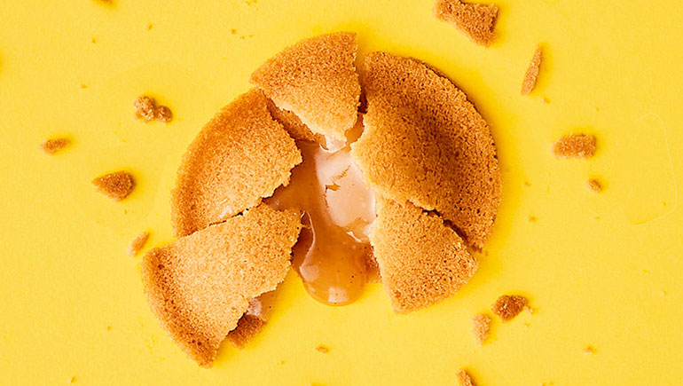 「フォンダンサンド」は、かりっとした食感の薄焼きラングドシャの中に、とろける生バターキャラメルがサンドされている。バターの香りたっぷりのラングドシャが、サクサクッと砕け、コクのあるキャラメルがとろ~りと口の中で溶けていく。