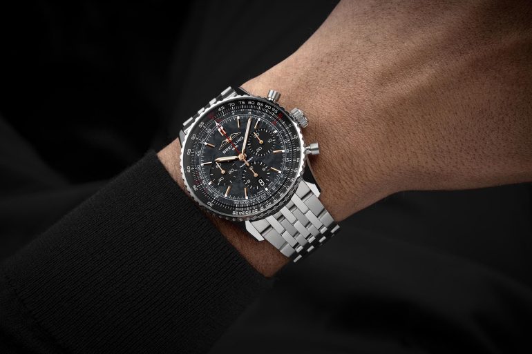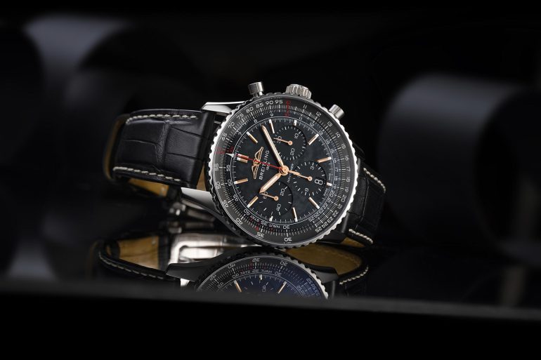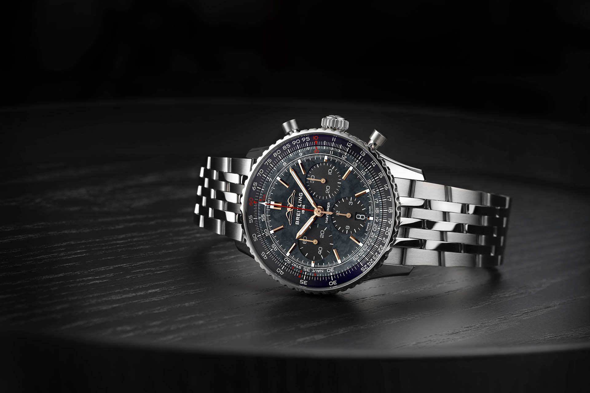 ブライトリングのアイコニックなクロノグラフ「ナビタイマー」から、ブラックのマザーオブパールダイヤルにブラックのサブダイヤルを組み合わせたオールブラック仕様が登場。