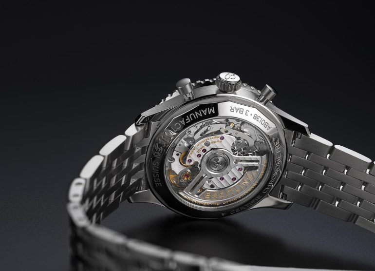 搭載されるのはマニュファクチュール・クロノグラフ、ブライトリング キャリバー 01。サファイアクリスタル・ケースバック越しに、その精緻な動きを眺めることが可能だ。