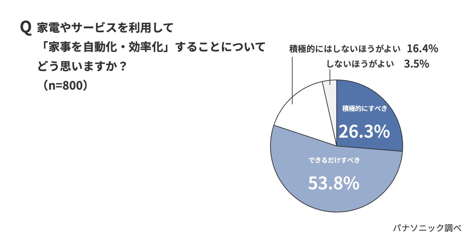 「あなたは、家電やサービスを利用して『家事を自動化・効率化』することについて、どう思いますか?」と聞いたところ、「積極的にすべき」が26.3%、「できるだけすべき」が53.8%となり、合わせて約8割の人が家事の効率化に前向きであることがわかった。