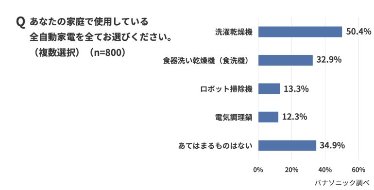 一方で、2位の「食器洗い乾燥機」は32.9%、「ロボット掃除機」は13.3%、「電気調理鍋」は12.3%にとどまり、洗濯に比べると食器洗いや掃除、調理といった他の家事は、まだまだ効率化の余地があることが浮き彫りに。