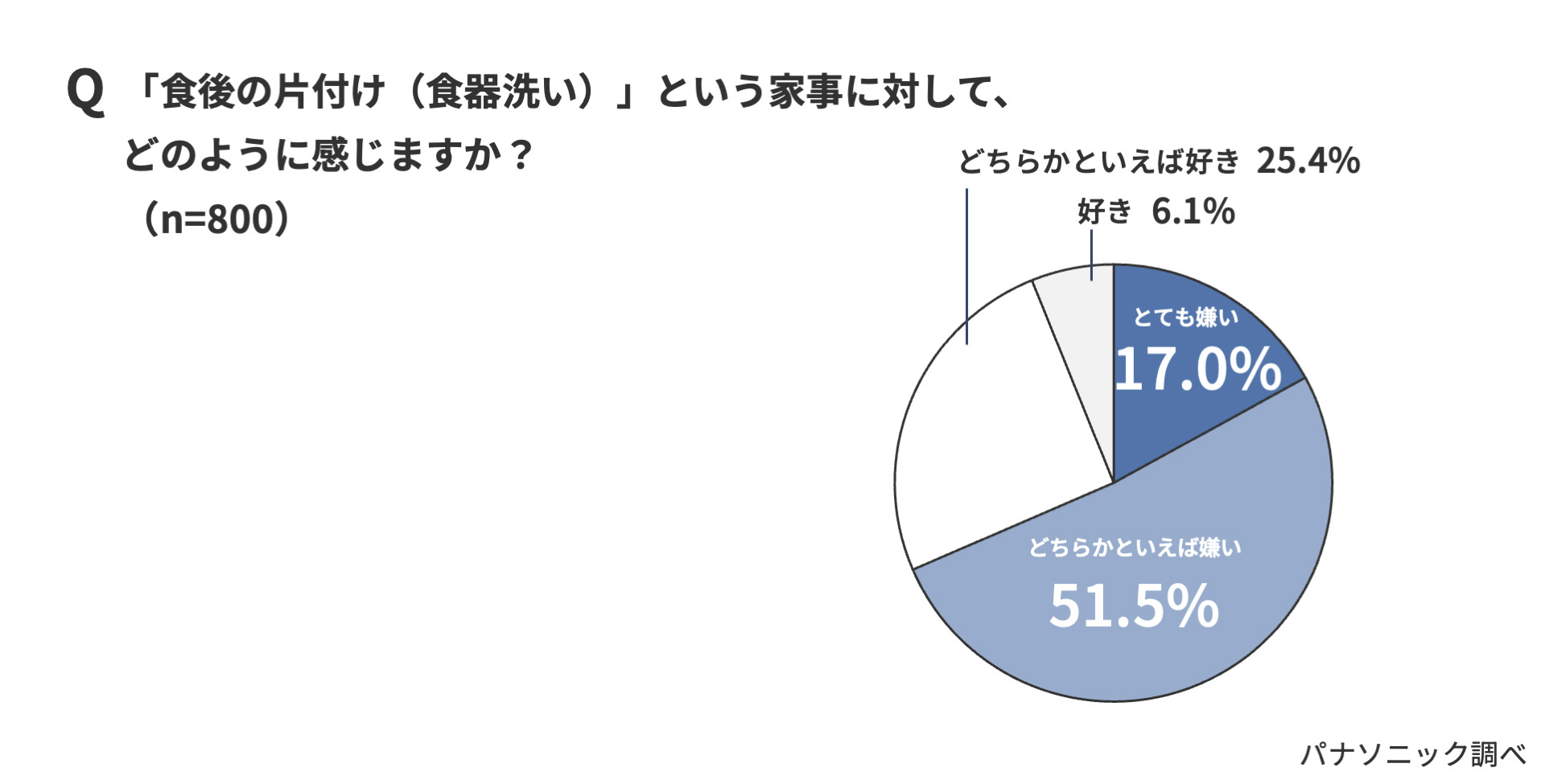 「あなたは『食後の片付け(食器洗い)』という家事に対して、どのように感じますか?」と聞いたところ、「好き」と答えた人は6.1%、「どちらかといえば好き」は25.4%にとどまっていた。
