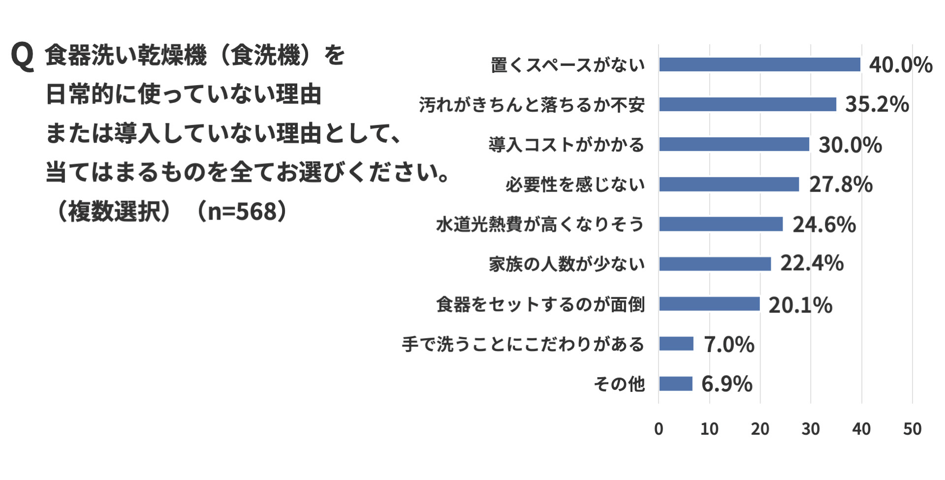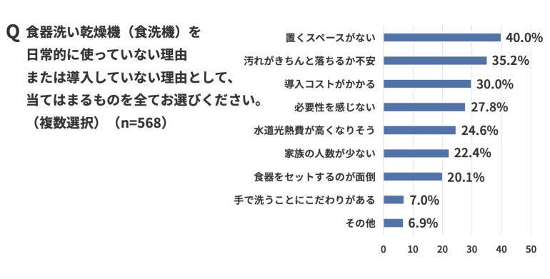 続いて、日常的に食器洗い乾燥機(食洗機)を使っていない人に対し、「あなたがご自宅で『食器洗い乾燥機(食洗機)』を日常的に使っていない理由(または導入していない理由)として、当てはまるものを全てお選びください。」と質問したところ、「置くスペースがないため」が40.0%で1位、「汚れがきちんと落ちるか不安」が35.2%で2位となり、物理的な制約と心理的な不安が、導入の大きなハードルになっていることが見えてきた。