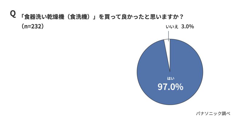 すでに日常的に食洗機を使用している人に「『食器洗い乾燥機(食洗機)』を買って良かったと思いますか?」と聞いたところ、「はい」と答えた人が実に97.0%に達し、導入後の満足度が非常に高いことが判明。