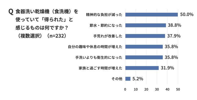 また、「あなたが『食器洗い乾燥機(食洗機)』を使っていて、『得られた』と感じるものは何ですか?」との問いには、「食後の『片づけなければ』という精神的な負担が減った」が50.0%で最も多く選ばれた。
