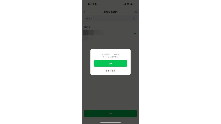 ブロックされていない友だちに、コイン不足の状態でスタンプをプレゼントしようとすると、上の画像のように「コインが不足しています。チャージしますか?」と表示されます。