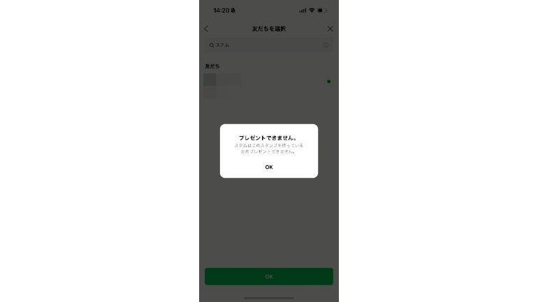 一方、ブロックされている友だちに、コイン不足の状態でスタンプを送ろうとすると、(このスタンプを持っていないのにも関わらず)「プレゼントできません。」と表示されます。