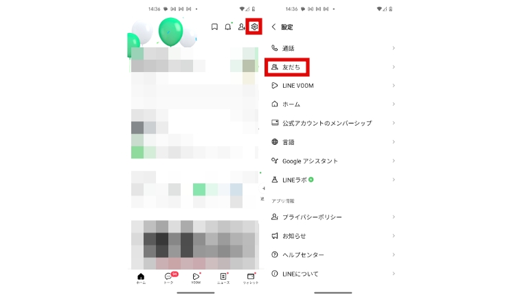 1.「ホーム」画面右上にある「設定」(歯車マーク)のアイコンをタップ→「友だち」をタップ