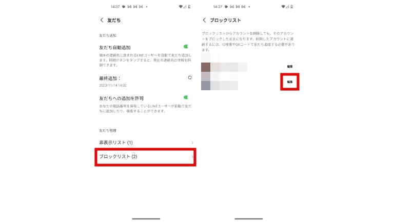 2.「ブロックリスト」を選択。ブロックを解除したいアカウントの「編集」(Androidスマホの場合)/アイコン(iPhoneの場合)をタップ