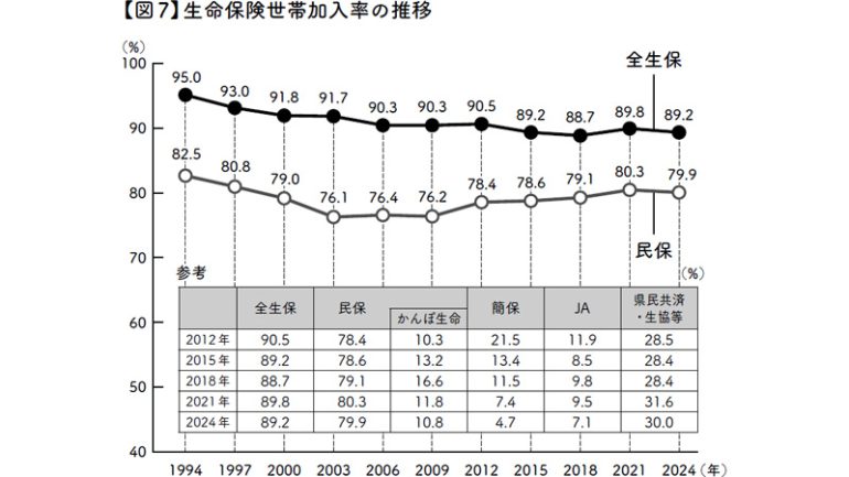 もともと、日本人は保険好きといわれています。最近の加入状況を見ると、大きな伸びはないものの、世帯加入率は9割前後で推移しており、民間の保険に関しては増加傾向です。ほとんどの世帯が保険に加入している状況です(下の図参照)。
