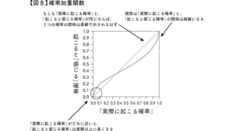 このグラフが曲線になることからわかるように、「実際に起こる確率」と「起こると感じる確率」は一致しません。確率が100%に近いけれど、絶対に起きるとはいえない場合、それがたとえ99.9999%といった高確率でも、その数値より低く感じます。