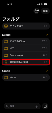 作ったはずのメモがなかなか見つからない場合、間違って削除した可能性があるので、まずは最初に説明した手順で「最近削除した項目」を確認しましょう。