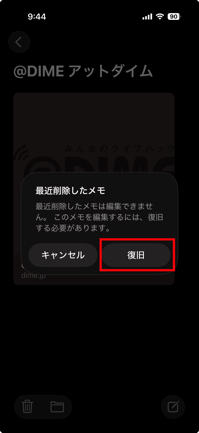 4.復元したいメモの画面をタップし、「復元」を選んで完了です。