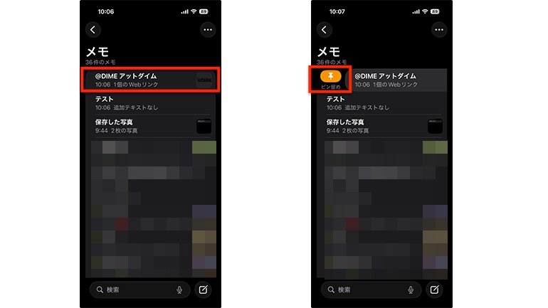 よく使うメモや重要なメモをピンで固定しておくと、上位表示されて見つけやすくなります。