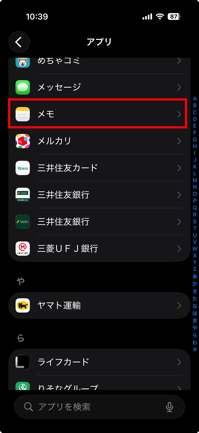 1.iPhone本体の「設定」を開いて「アプリ」→「メモ」をタップ
