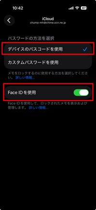 3.「デバイスのパスコードを使用」をチェック。Face IDを使用する場合はオンにします。