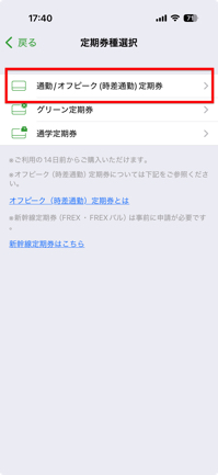 4.定期券種を選びます。ここでは例として、「通勤/オフピーク(時差通勤)定期券」をタップします。