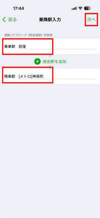 5.乗降駅を入力します。例として「荻窪」「[メトロ]神保町」を入力し、「次へ」をタップ。
