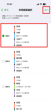 6.利用経路が選べます。例として「経路1」を選び、「次へ」をタップします。