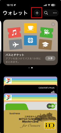 Apple Walletアプリを開いて、追加ボタンをタップ。