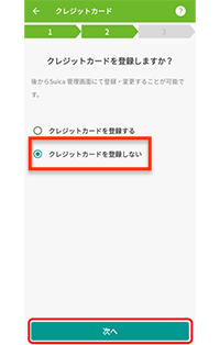 6.「クレジットカードを登録しない」を選択し、「次へ」をタップ。