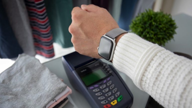 2.Apple Watchのディスプレイを非接触型カードリーダーから数センチ以内に近づけます。