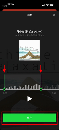 4.BGMに設定したい曲のパートを調整(矢印の先の緑のバー)して、「保存」をタップ