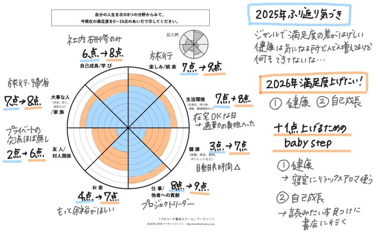 2026年にどうありたいか(何点でいたいか)を同じチャートに描く。2025年と別の色を使うと、現在と未来のギャップが一眼でわかる。このギャップはこれからの“伸びしろ”となる。