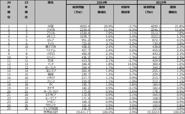 ※前年の世界総消費量も最新の値に変更している(約1億8,793万kl⇒ 1億9,323万klへ変更