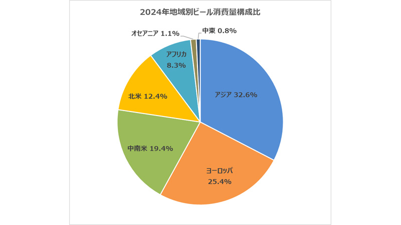 2024年の世界のビール総消費量は、前年より約89万kl(大びん633ml換算で約14億本)増え、約1億9,412万kl(前年比0.5%増、大びん633ml換算で約3,067億本)となった。東京ドーム約157杯分(東京ドーム1杯は約124万kl)に相当する。