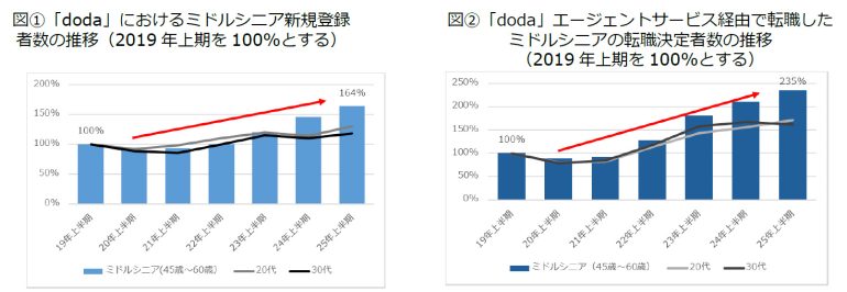 現に、ミドルシニアの転職市場は活況な状況がつづいている。2025年上期時点で、転職サービス「doda」に新規登録したミドルシニアは2019年同期比の164%に増加、登録者数は2020年上期以降5年連続増加していた(図1)。