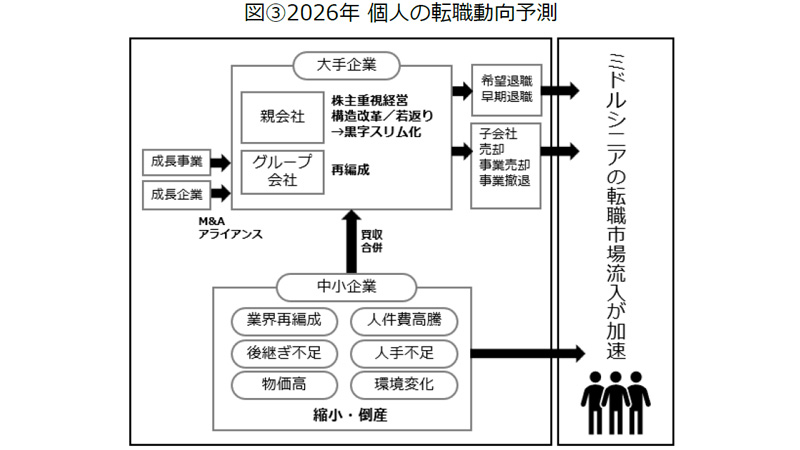 2026年は大手企業の構造改革や中小企業の合併・淘汰をきっかけに、転職市場はさらに活発になり、転職市場に流入するミドルシニアも一段と増加する見込みだ。