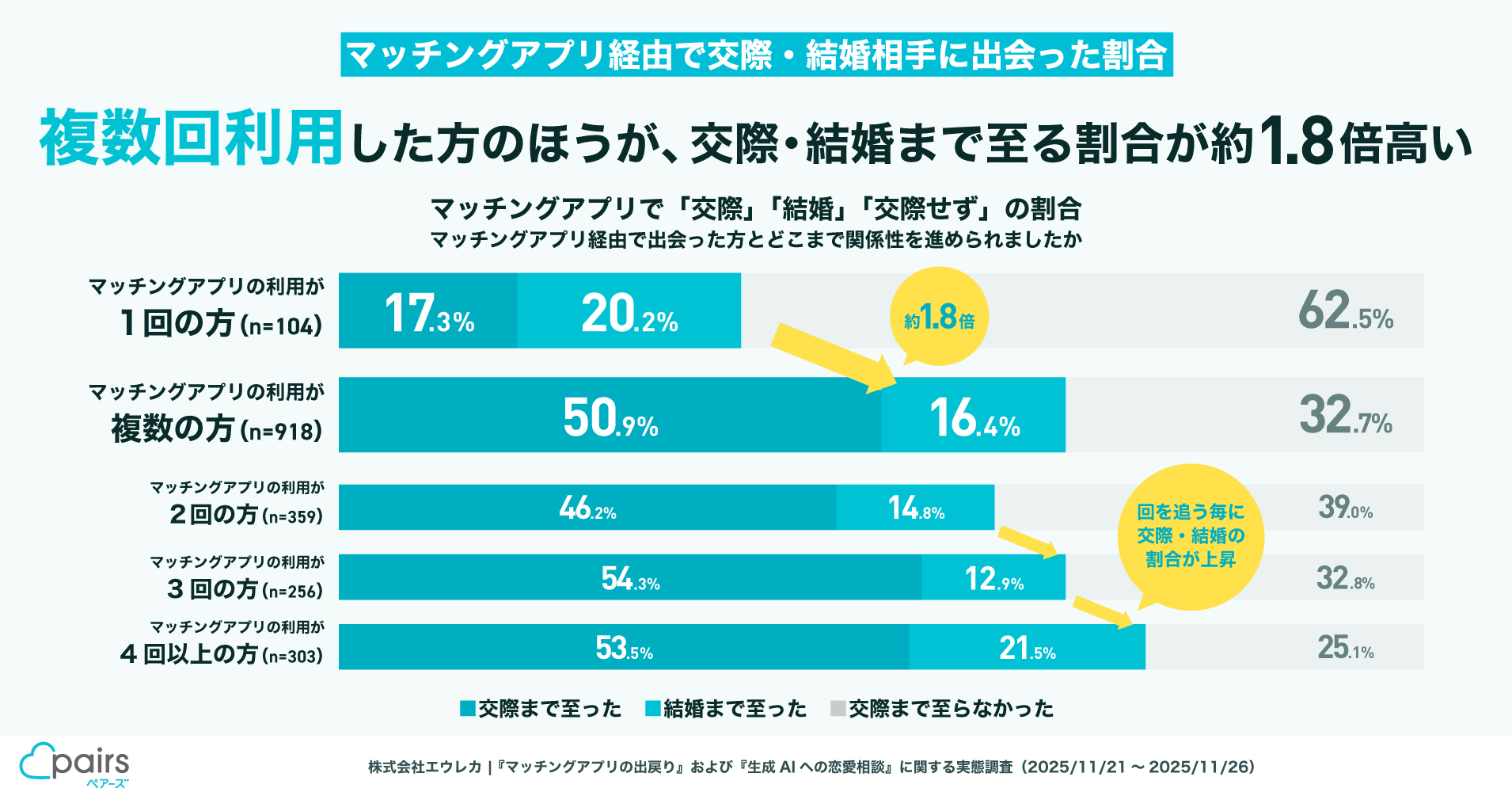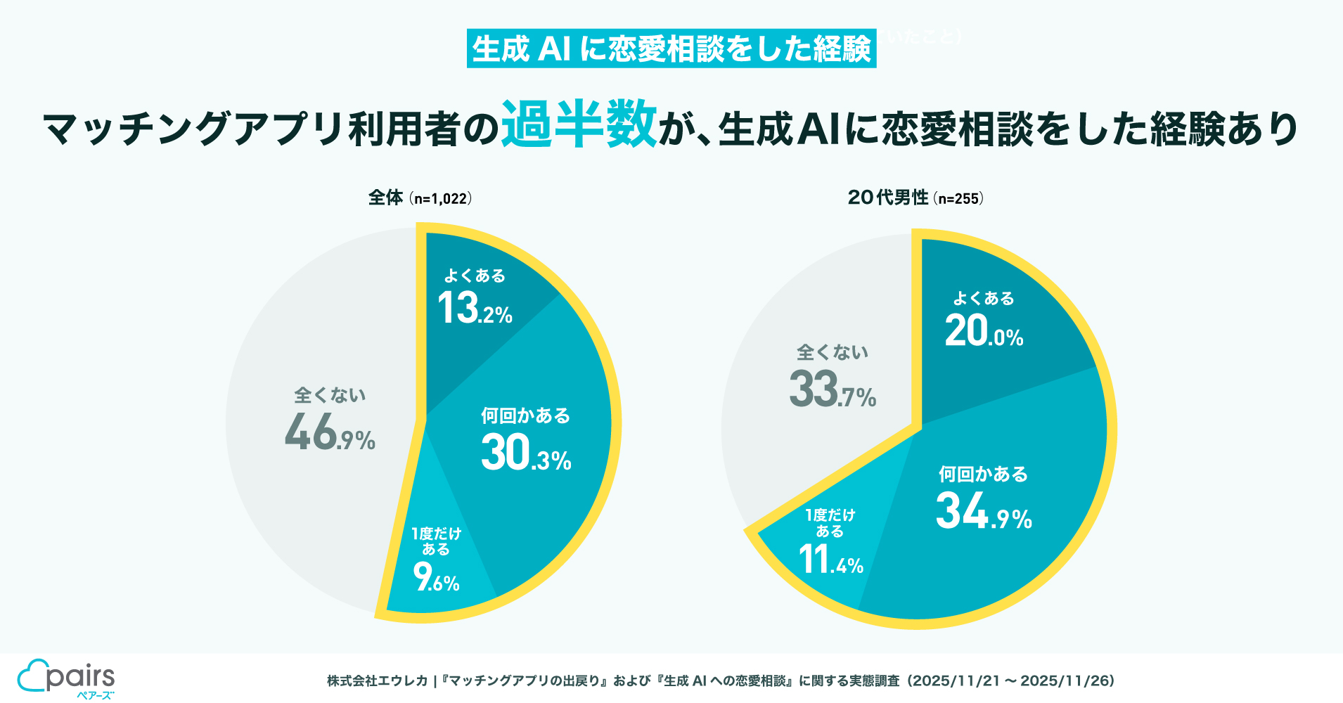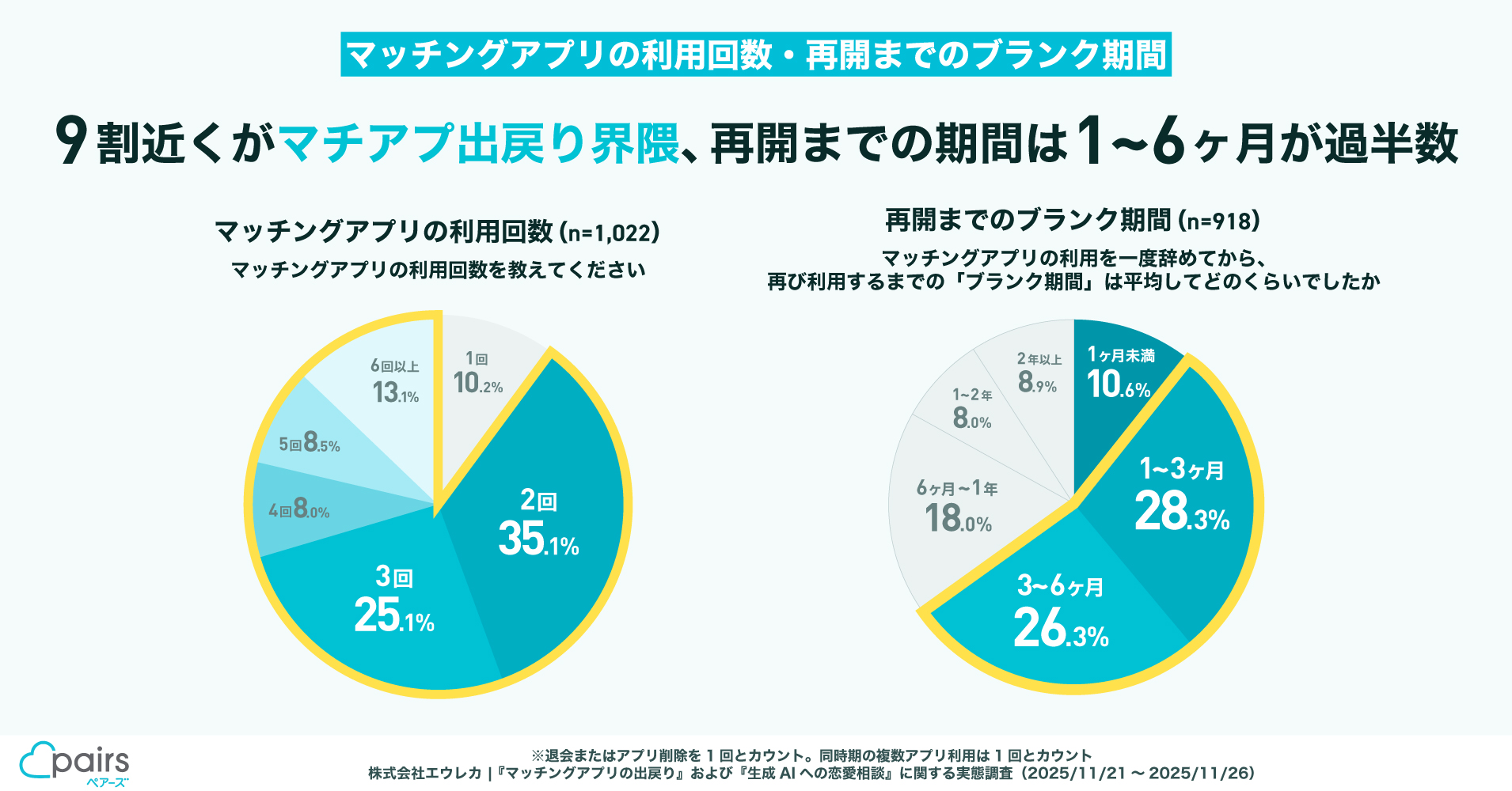 そこで恋活・婚活マッチングアプリ「Pairs(ペアーズ)」を運営するエウレカは、恋愛可処分時間が短い令和の若者がマッチングアプリをどのように利用しているのか明らかにすべく、マッチングアプリの利用経験がある全国の20代~30代の男女1,022人を対象に、「マッチングアプリの出戻り※2」および「生成AIへの恋愛相談」に関する実態調査を実施した。