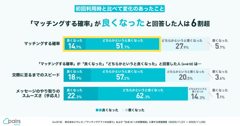 次に、利用を再開した918人に初回利用時と比べてアプリ体験に変化があったのか「良くなった」から「悪くなった」まで4段階で尋ねたところ「マッチングする確率」が「良くなった」「どちらかというと良くなった」と回答した人は66.5%であった。
