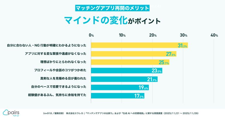 また、アプリの利用を再開して感じた、過去の利用経験が生きたメリットについて尋ねたところ、回答のTOP3は「自分に合わない人・NG行動が明確にわかるようになった」(31.2%)、「アプリに対する変な緊張や遠慮がなくなった」(27.5%)、「理想ばかりにとらわれなくなった」(25.7%)。