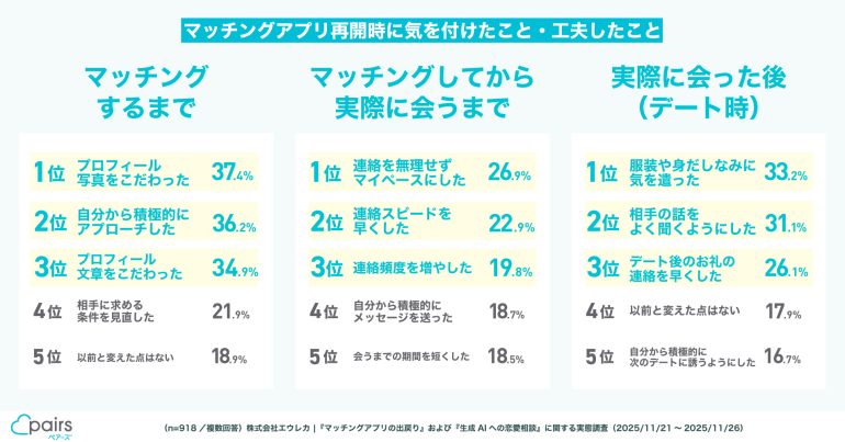 最後に、過去の利用経験を踏まえて具体的に気をつけた、工夫したポイントについて「マッチングするまで」「マッチングしてから実際に会うまで」「実際に会った後(デート時)」の3つのシーンに分けて尋ねたところ、最も気をつけた工夫したポイントは「プロフィール写真をこだわった」(37.4%)であった。