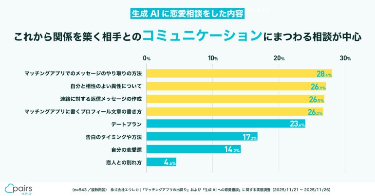 最後に生成AIに対する相談内容を複数回答で尋ねたところ「マッチングアプリでのメッセージのやり取りの方法」が28.4%でトップであった。