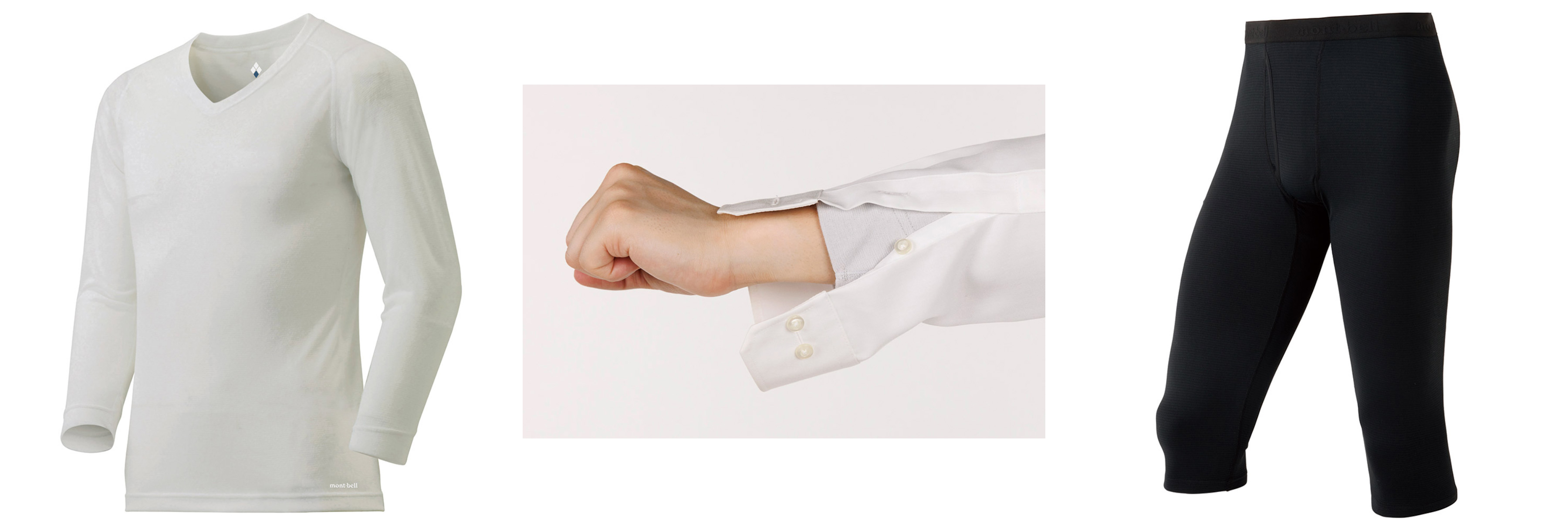 「ワイシャツの下に身につけても見えにくいアンダーシャツや、重ね着しやすい膝丈のタイツなどもあります。『モンベル』オリジナル素材の『ジオライン』は、軽量で乾きやすいポリエステル100%。お店でも手頃な価格と使いやすさで人気のシリーズです。どちらも防臭機能も備えています」