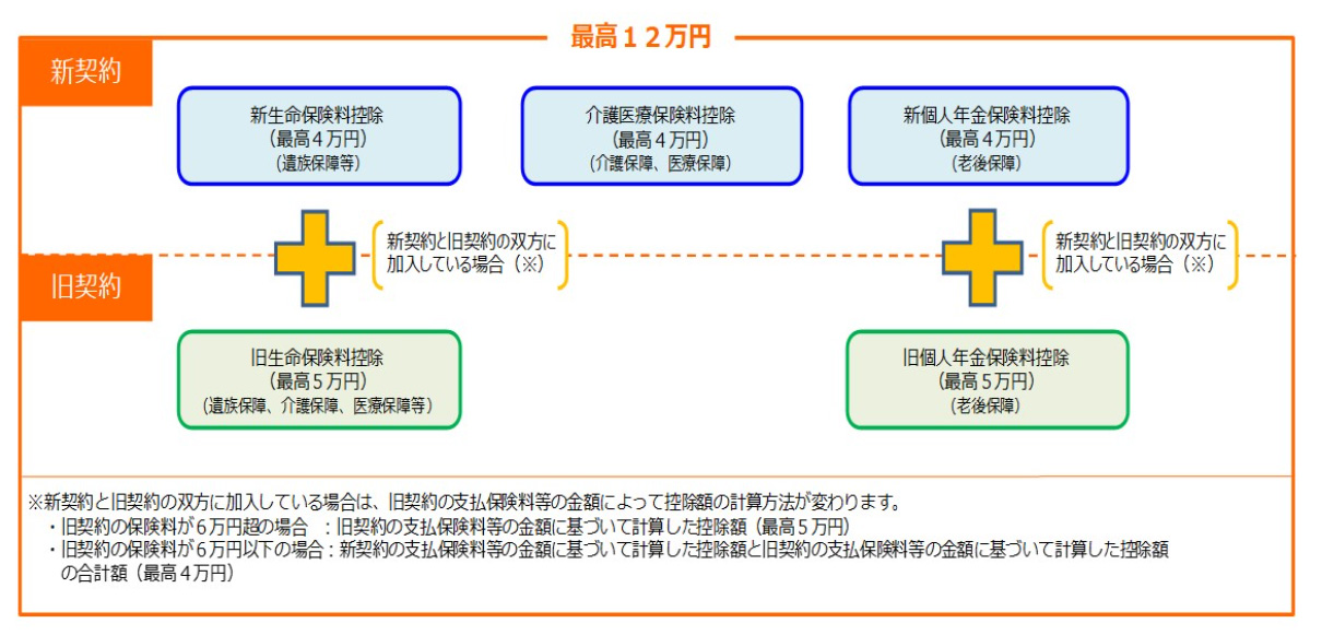 生命保険料控除と介護医療保険控除と個人年金保険料控除でそれぞれ最高4万円の控除になる。これに2012年以前に契約した保険が入っている場合には、旧契約の分も考慮される。