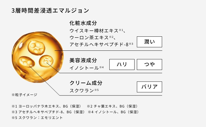 「毛穴よりも小さいカプセルに、化粧水・美容液・クリームを層状に閉じ込める三層時間差浸透技術を採用しています。肌に塗ると、まず化粧水成分が浸透してうるおいの道を作り、次に美容液成分が肌悩みに働きかけ、最後にオイルベースのクリームでうるおいを閉じ込めます。