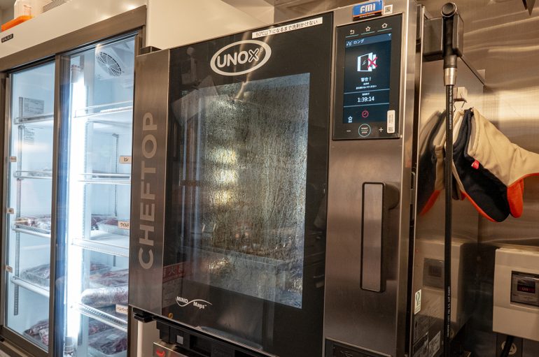 最大の変革は調理工程だ。いきます!ステーキの店舗の象徴である従来のチャコールブロイラーを廃し、スチームコンベクションオーブンを導入した。これにより、260度の高温を安定的に保ち、3~4分で一度に20食分を焼き上げることができる。
