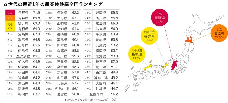 ■α世代の直近1年の農業体験率1位:長野県、2位:青森県、3位:福井県・島根県