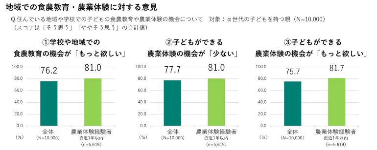 「そう思う」「ややそう思う」の合計値を見ると、学校や地域での食農教育の機会について、76.2%の親が「もっと欲しい」と答えており、農業体験の機会についても、77.7%が「少ない」、75.7%が「もっと欲しい」と答えた。