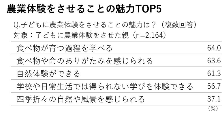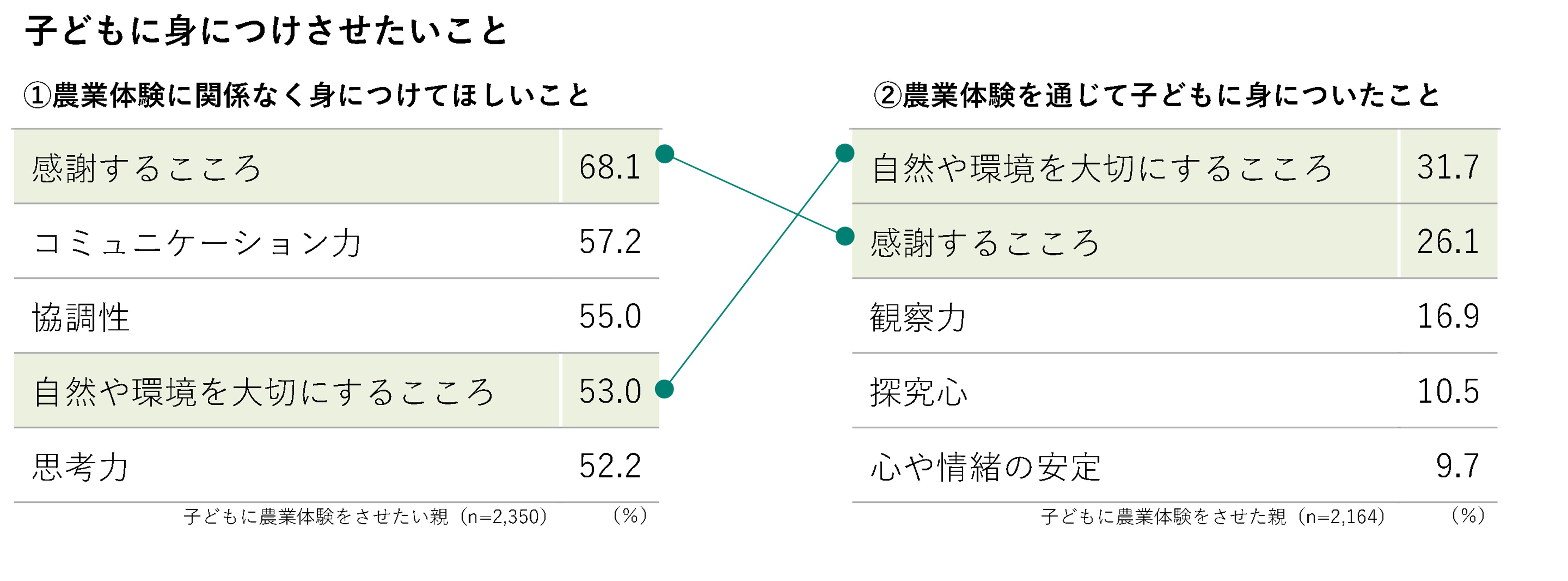 農業体験により、子どもに身につけてほしい上位5つのうち「自然や環境を大切にするこころ」「感謝するこころ」の2つが実際に獲得できるようだ。