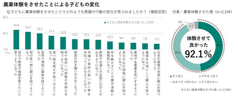 「実際に子どもに農業体験をさせた親」に、農業体験をさせたことで子どもにどんな変化が見られたか、当てはまるものを聞いた。すると、「自分で野菜や植物を育てたいと思うようになった」(24.9%)、「旬の食べ物に関心を持つようになった」(22.4%)、「自然や環境に興味を持つようになった」(20.4%)が上位に挙げられ、また、92.1%が「農業体験をさせて良かった」(そう思う48.3%+ややそう思う43.9%)と答えた[図8]。