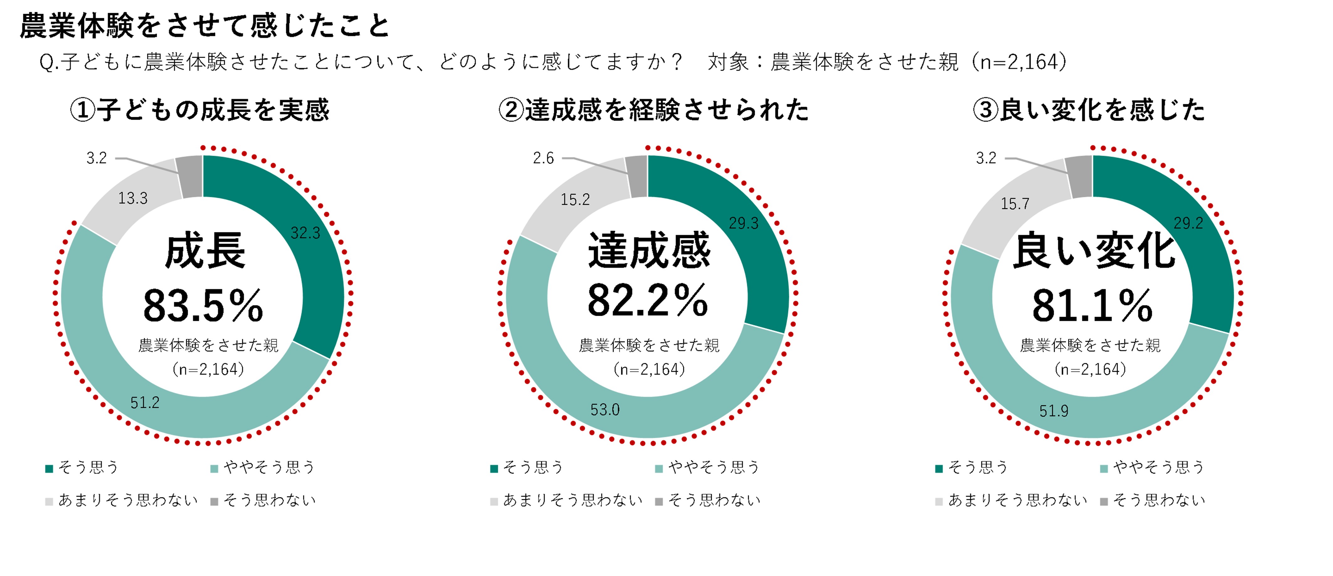 農業体験を通じて、約8割の親が子どもの「成長」「達成感の経験」「良い変化」を実感